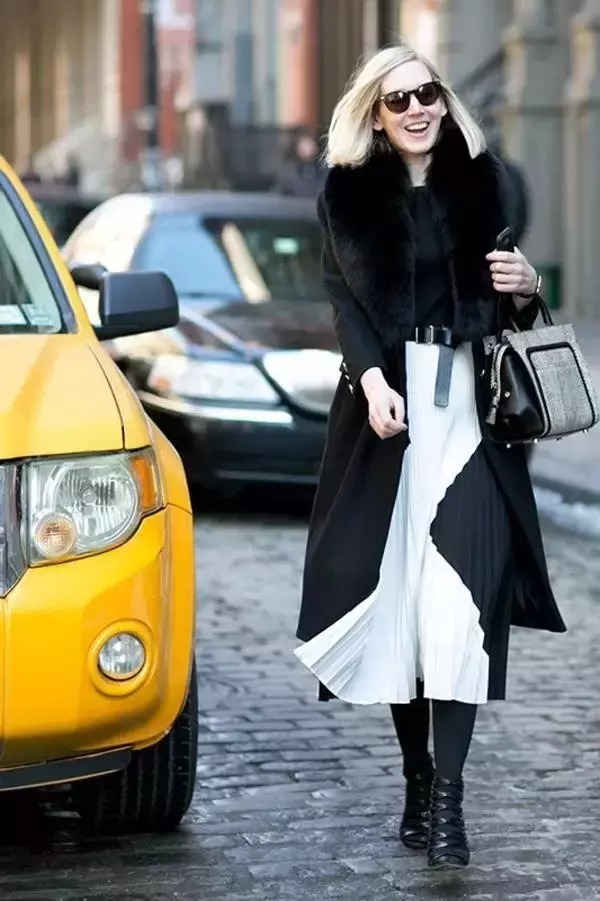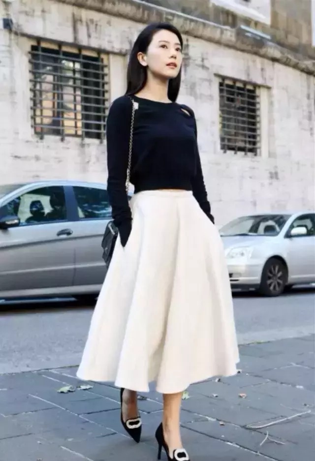 想要穿出优雅得体大方的感觉,那么麦琪推荐毛衣+伞裙的搭配方式,简单的黑白配,就可以把优雅的魅力气质展现的淋漓尽致。