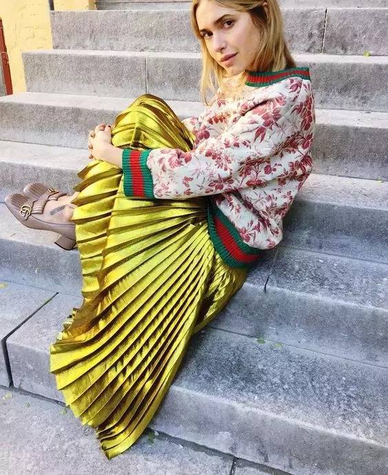 GUCCI派的文艺范女青年,流行复古花纹毛衣搭配金属百褶裙,再往脸上架一个奶奶牌大框镜,绝对的时髦个性!