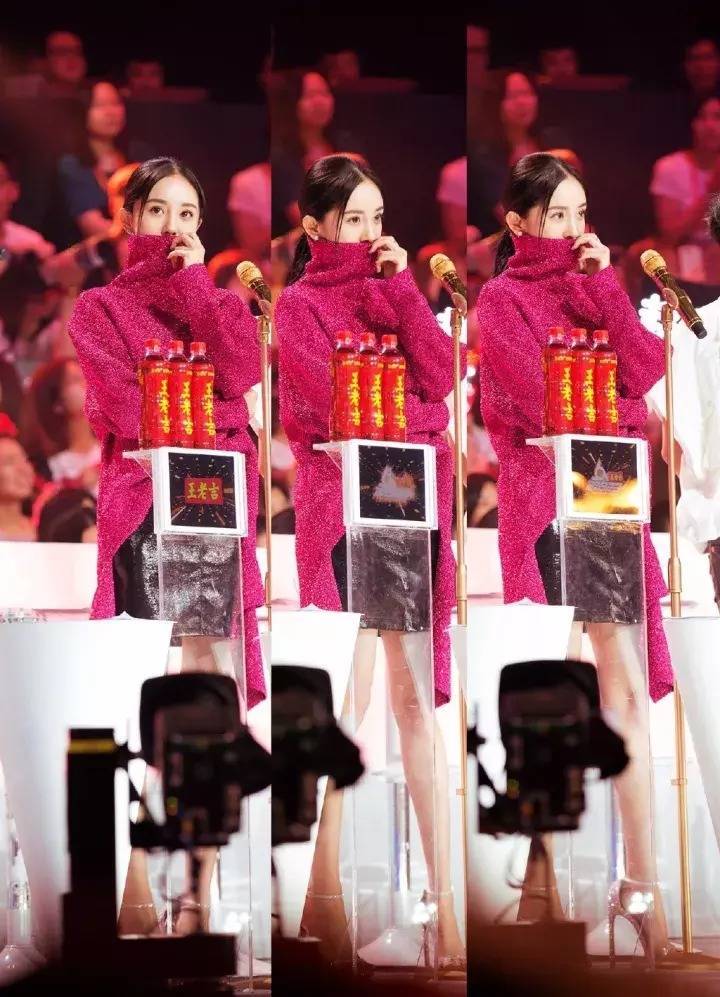 杨幂上身穿着Balenciaga高领金属色毛衣,搭配Stylenanda仿皮裙,整套搭配非常耀眼时髦!