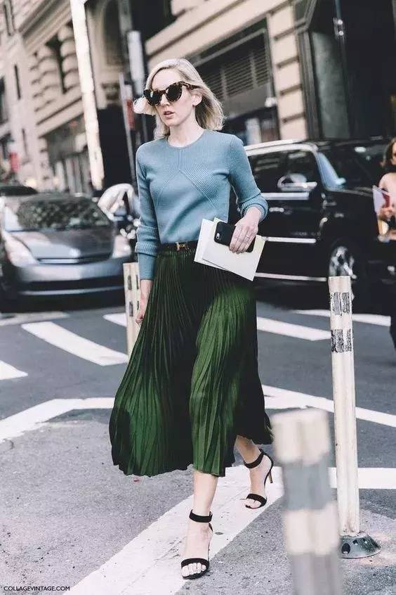 墨绿+蓝色,是今年最流行的配色方案,在选择服装的时候,推荐选择不饱和的颜色会显得更加高级。